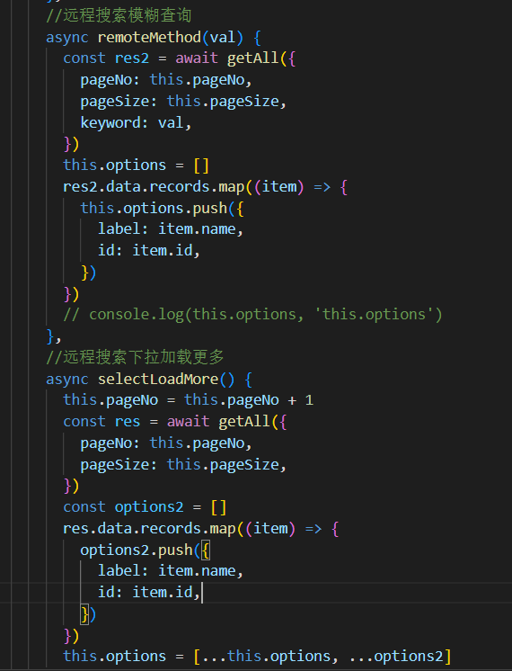 遇到的问题:因为远程搜索可能有选中的项,比如选中的项是第十三条,但是懒加载首次只加载了十条数据,这样一来选中的项无法展示出来,展现出来的是没有文字的框。我解决的方法是,将选中的项从数组中提取出来,添加到首次加载的数组里前面,这样点开远程搜索,上方展示的就是已经选中的内容。对剩下的数组进行遍历,如果数组中的内容含有选中项,已经加载过了,那么将这项从数组中删除,然后将数组添加到加载出来的数组中,可能比较麻烦,但是是我能想出来的唯一办法了,但是公司需求改了,代码被删了,上方是远程搜索的代码。
